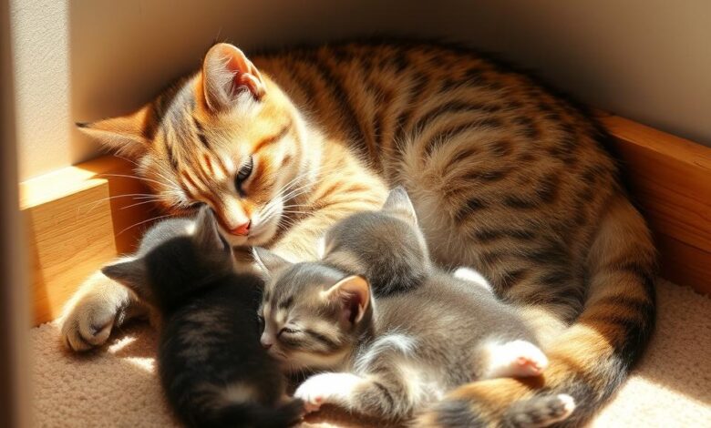 Explore the bond between a mother cat and her kittens, learning how she nurtains and shields her young in a…